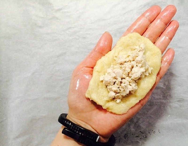 Do każdej części włożyć niewielką ilość mięsa mielonego i delikatnie połączyć brzegi ciasta. Smaż ciasto w oleju słonecznikowym na złoty kolor.