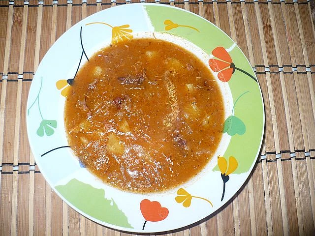 Następnie dodać odsączoną kapustę i gotować do miękkości. Wędzone mięso pokroić na kawałki i dodać do zupy, doprawić solą i cukrem. Smacznego!