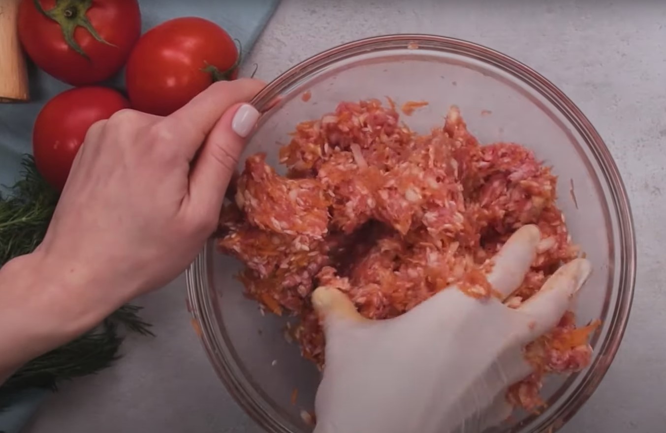 Cebulę obierz i drobno posiekaj. Wymieszaj ją z mięsem i ryżem. Marchew obierz i zetrzyj na tarce o drobnych oczkach. Czosnek przeciśnij przez praskę. Dodaj do masy mięsnej jajko, czosnek i marchew, dopraw i starannie wymieszaj.