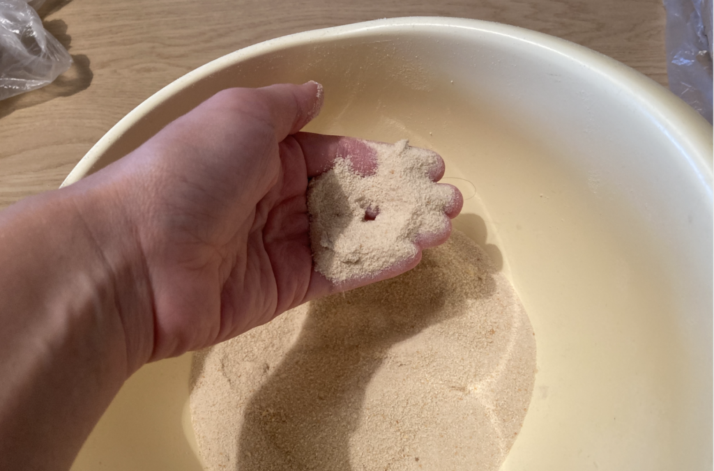 Najpierw przygotuj chleb – pokrój na kawałki i odkrój skórkę. Skórkę od chleba suszymy w piekarniku przez kilka minut, aby przygotować z niej okruchy. Miękki środek chleba zalej wodą lub mlekiem i pozostaw do zmiękczenia.