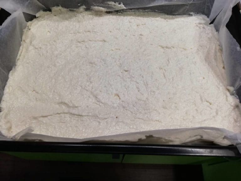 Wierzch posyp wiórkami kokosowymi i udekoruj w razie potrzeby orzechami laskowymi, migdałami lub cukierkami Raffaello. Pozostaw do ostygnięcia i podawaj. Życzymy smacznego! 🙂
