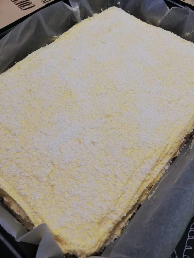 Białka ubić na sztywną pianę razem z cukrem. Mąkę i wiórki kokosowe mieszamy i delikatnie mieszamy z pianką. Warstwa na blasze wyłożonej papierem. Pieczemy w 170°C przez około 20-25 minut.