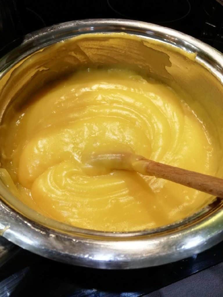 Dodaj 3 łyżki mleka do śmietanki. Wymieszaj żółtko z budyniem w proszku, 100 ml mleka i pół cukru do uzyskania jednolitej śmietanki. Dodać wrzące mleko i gotować do zgęstnienia, cały czas mieszając, a następnie ostudzić.