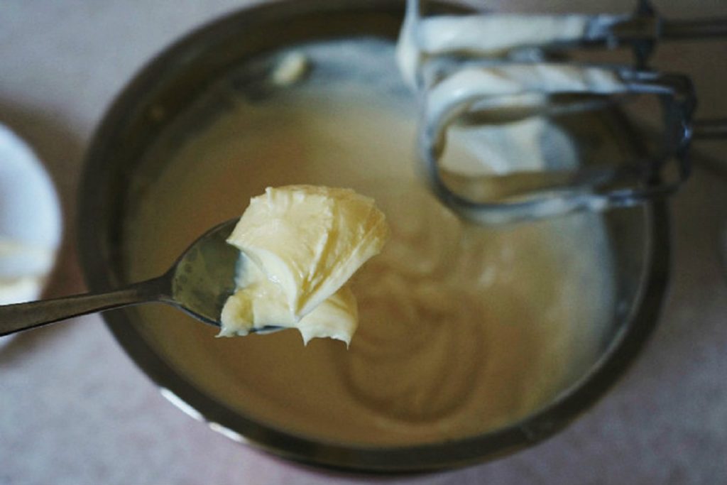 Podczas tego procesu cały czas mieszamy, aż masa zgęstnieje. Następnie zmięknięte masło bierzemy do osobnej miski i ubijamy trzepaczką.