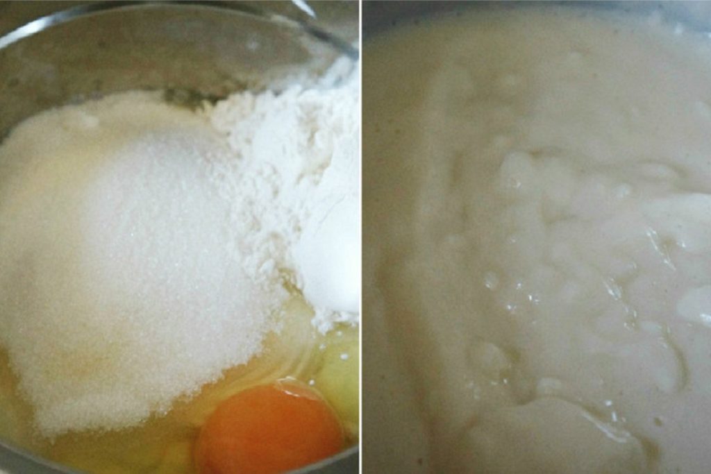 Następnie bierzemy śmietanę i mieszamy ją z jajkiem oraz cukrem. Do tego dodajemy mąkę oraz wanilię.
