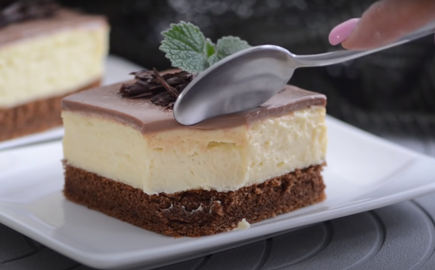 Gotowe ciasto wstawiamy do lodówki na kilka godzin lub całą noc, aby się zestaliło. Po wyjęciu można je dodatkowo udekorować startą czekoladą i listkami mięty. Smacznego!