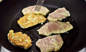 Kontynuuj, posypując marynowane mięso zwykłą mąką i ponownie dobrze mieszając z mięsem. Podgrzej kilka kropli oleju roślinnego na patelni i umieść na nim pierwszą partię mięsa. Nie trzeba go długo smażyć, ponieważ mięso jest bardzo cienkie. Gdy kotlety będą lekko złociste z obu stron, zdejmij je z patelni i podawaj.