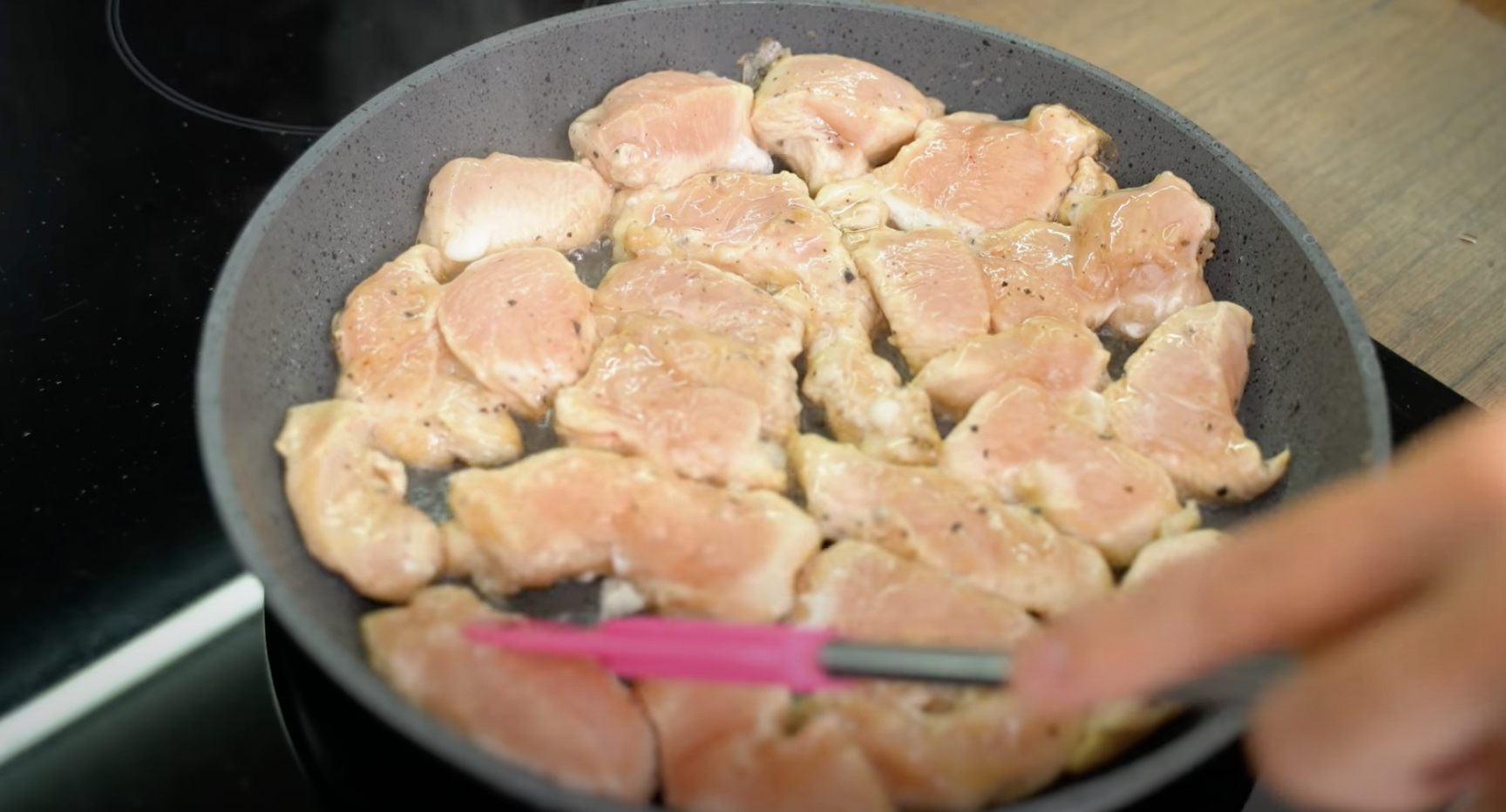 Na patelnię wlej olej i dobrze go rozgrzej. Wrzuć mięso i smaż aż kurczak zrobi się złocisty i miękki. Nie smaż zbyt długo (wtedy zrobi się gumowaty i twardy)