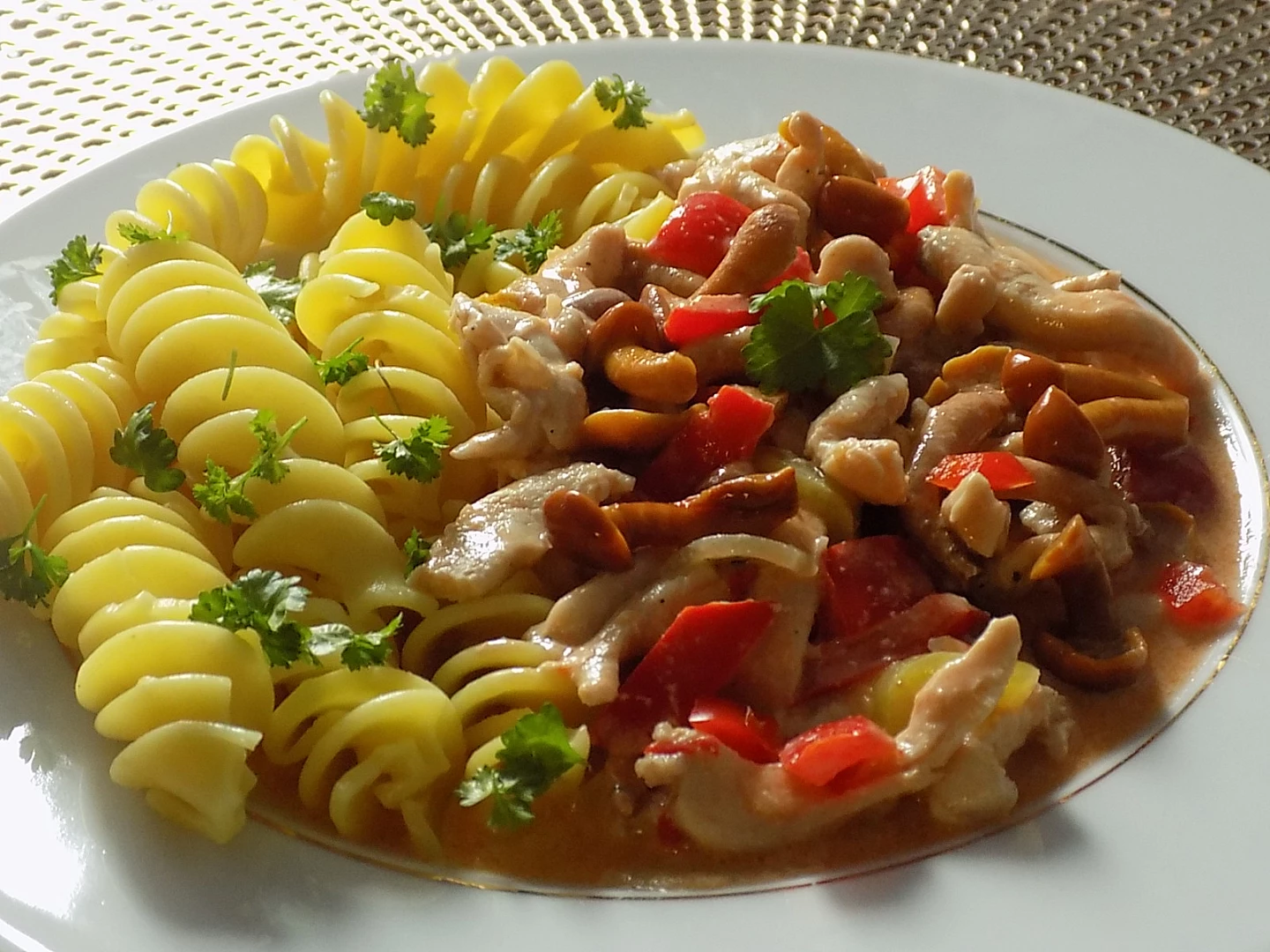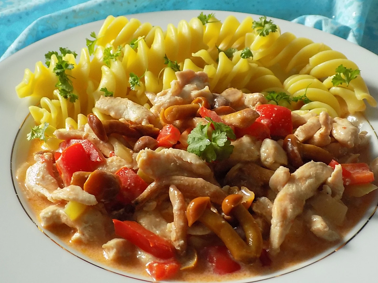 Makaron z kurczaka z marynowanymi grzybami i papryką. Przepis krok po kroku.