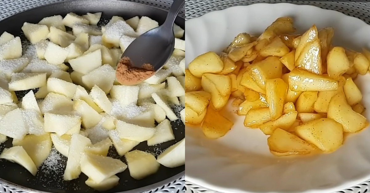 Przede wszystkim przygotuj nadzienie. Obierz jabłko i rdzeń. Miąższ pokroić w plasterki, wlać na patelnię. Posyp jabłka 2 łyżkami. l. cukier i cynamon. Smaż jabłka do karmelizacji w 1 łyżce masła. Jajko wymieszaj w misce ze szczyptą soli i cukru waniliowego. Dodaj tam resztę cukru.