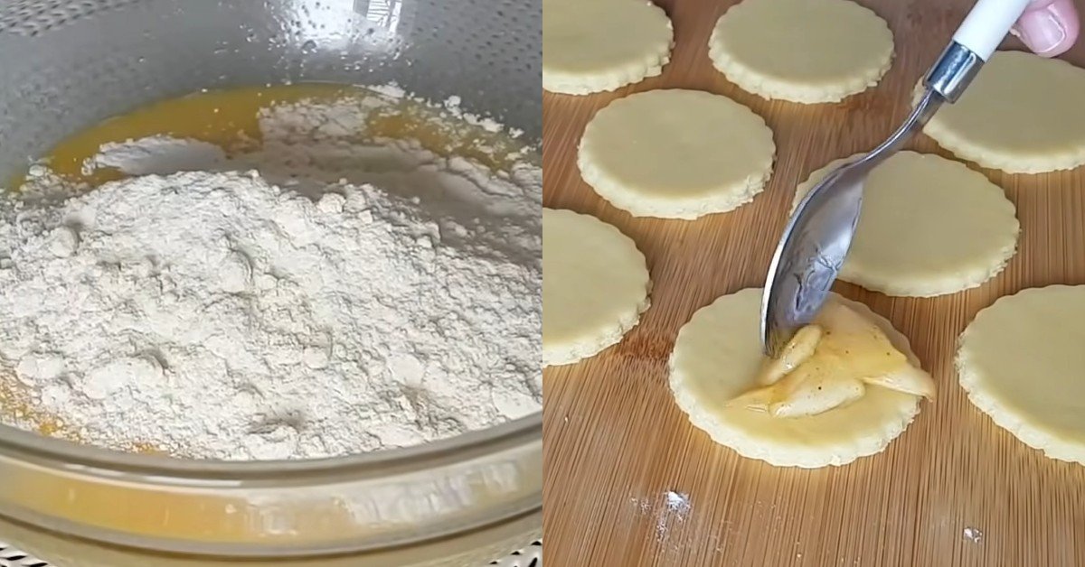 Do masy jajecznej wmieszać mleko i roztopione masło (50 g). Teraz dodaj proszek do pieczenia, stopniowo dodawaj mąkę. Zagnieść miękkie jednorodne ciasto. Na posypanej mąką powierzchni rozwałkować ciasto na warstwę, wyciąć z niego kółka. Rozłóż nadzienie i złóż kółka książką.