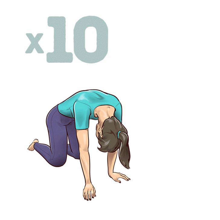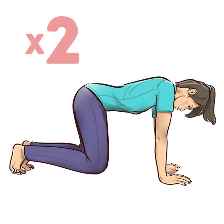 Pozycja kolanowo-dłoniowa, wykonywanie koci grzbietu i odwrotnego wygięcia pleców, powtórzenie co najmniej dwa razy.