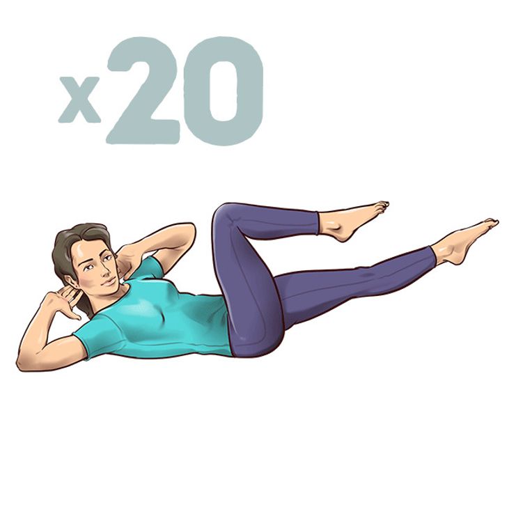 Leżenie, ręce za głową, uniesienie nóg i obrót głowy na przemian, powtórzenie 10 razy.
