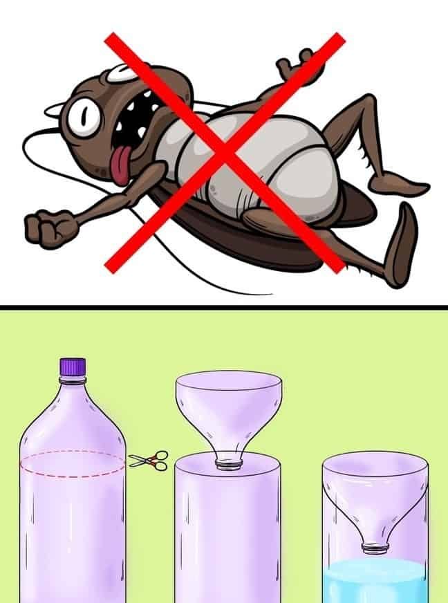 Skonstruuj pułapkę z pustej plastikowej butelki, odciętej u góry i złożonej według instrukcji na rysunku. Użyj taśmy klejącej do zabezpieczenia i wlej nieco wody. Karaluchy, przyciągnięte zapachem wody, wchodzą do butelki, ale nie są w stanie się z niej wydostać.