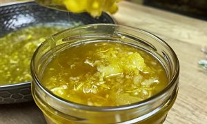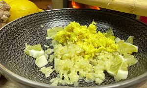 Dodaj także drobno starty, obrany imbir do tej samej miski. Następnie, wyciśnij sok z drugiej cytryny, wlej go do miski, dodaj miód i dokładnie wszystko wymieszaj.