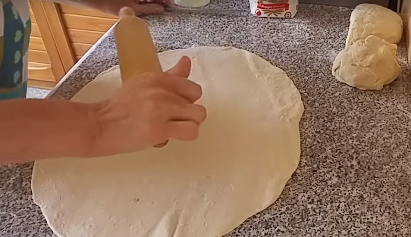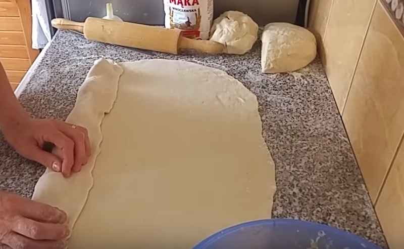 Na początku należy rozwałkować ciasto ( na grubość 2-3 mm ), nie zapominając o podsypaniu z obu stron mąką, aby nie przywierało ono do stolnicy.