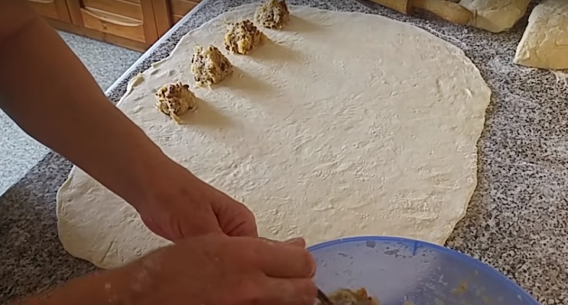 Następnie zawijając jednorazowo ciasto przykryć nałożony farsz.