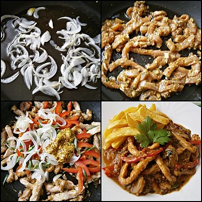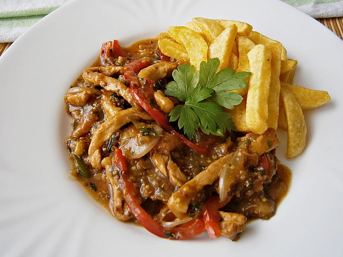 Na koniec doprawiamy i podajemy. Smażone ziemniaki lub frytki z selera są dobre jako dodatek do dania głównego. Możemy też podawać tylko z ciastami. Uwaga autorki przepisu Nie zaszkodzi, jeśli zostawimy mięso w marynacie na noc. Jeśli nie mamy wina, do marynaty wbijamy jedno jajko i dolewamy niewielką ilość wody.