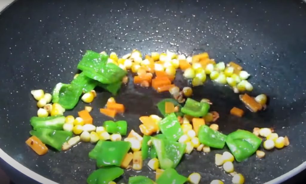 Na patelnię wlej trochę oleju, dodaj drobno posiekany czosnek i delikatnie podsmaż. Dodaj pokrojoną marchewkę (jeśli lubisz bardziej miękką, możesz chwilę ugotować), paprykę i kukurydzę. Dobrze wymieszaj.