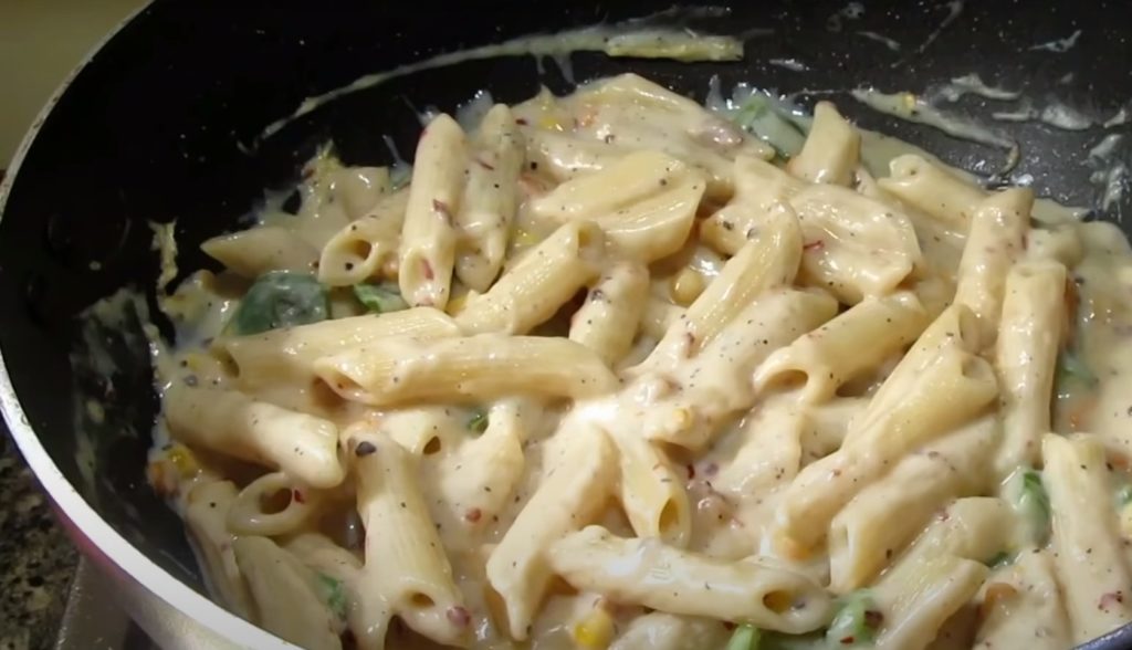 Dodaj resztę mleka i gotuj przez około minutę, cały czas mieszając. Dodać chili, przyprawy i zioła do smaku, posolić i dobrze wymieszać. Na koniec wymieszaj warzywa i makaron. Wszystko gotowe. Możemy podawać. Gotowy makaron można również posypać tartym serem.