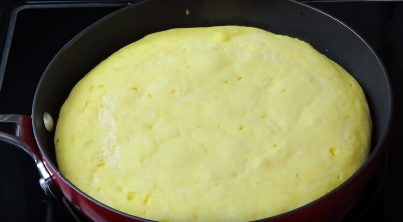 Na patelni rozgrzej porządnie olej, w tym samym czasie dodając do ciasta proszek do pieczenia. Przelej ciasto na rozgrzaną patelnię i smaż na średnim ogniu pod przykrywką przez ok. 5 minut. Powinno się zrobić złote. Z drugiej strony wystarczą 3 minuty smażenia.