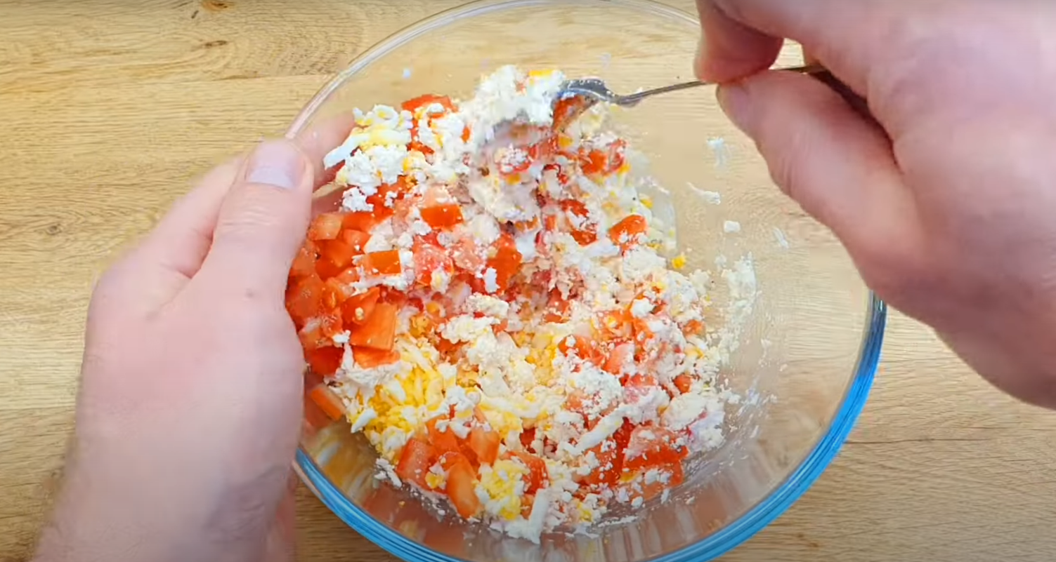 Zacznij od umieszczenia mięsa mielonego w misce i dokładnego wymieszania go z solą, pieprzem i ulubionymi ziołami. Następnie ugotuj jajka na twardo i zetrzyj je na tarce o grubych oczkach. Ser również zetrzyj na tarce. Pokrój pomidora na małe kawałki. Wymieszaj ser, jajka i pomidory z majonezem.