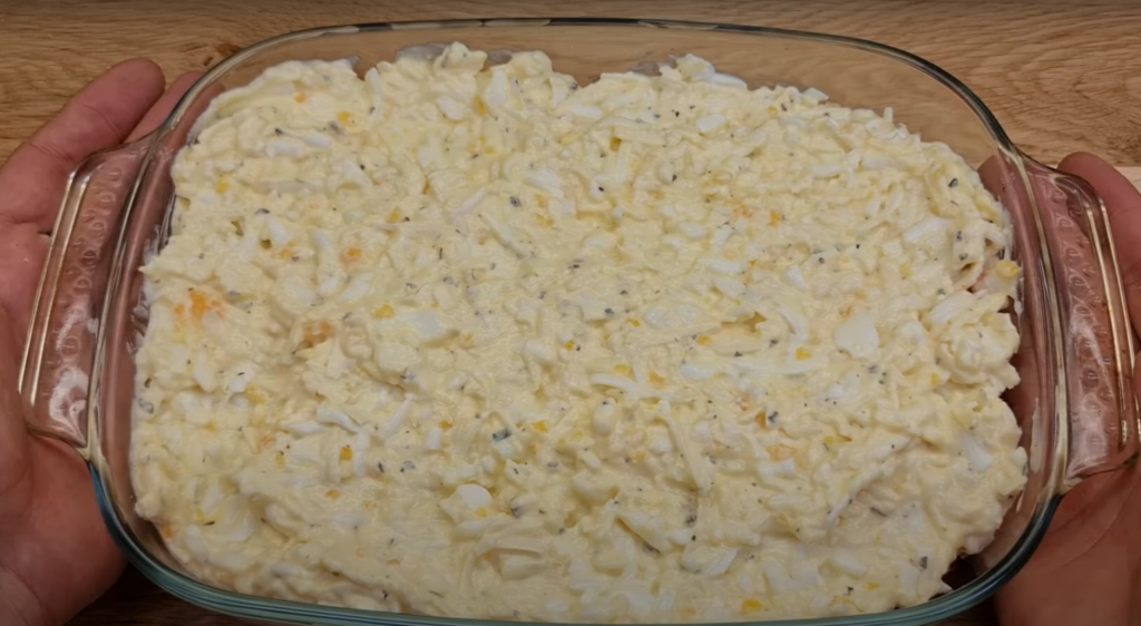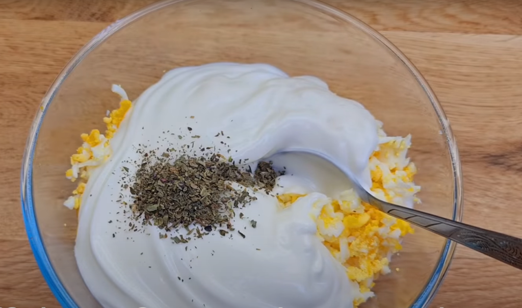 W osobnym naczyniu wymieszaj razem starty ser, jajka, jogurt naturalny, sól oraz bazylię.