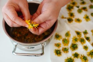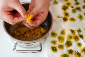 Gdy będą już suche, usuwamy wszystkie płatki i usuwamy zieloną część, która ma charakterystyczny, gorzki smak. Najlepiej jest znaleźć garnek o pojemności 1,5 – 2 litry – to on posłuży nam później do ugotowania syropu. Trzymając nad nim każdy kwiatek, oddzielamy płatki od zielonej części i wrzucamy je do środka.