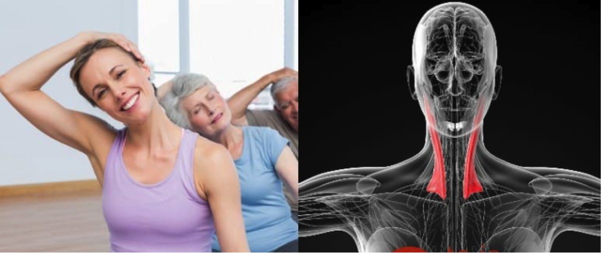 Plecy należy wyprostować, a głowę przechylić w prawo i próbować dotknąć prawego ramienia. Głowę należy tak trzymać 30 s. Następnie powtórzyć to ćwiczenie, ale w przeciwnym kierunku kierując głowę. Można nawet podeprzeć głowę lewą/prawą ręką.