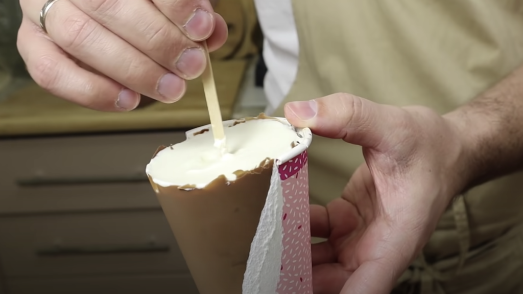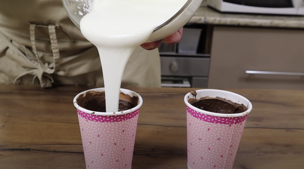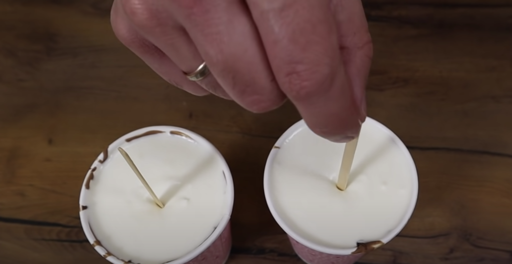 Napełnij pojemniki lodami. Włóż patyczek do środka i umieść w zamrażarce. Zamarzamy co najmniej 5 godzin lub najlepiej pozostawić na noc.