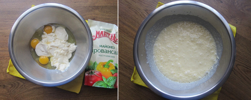 Do wyższej miski dodaj majonez, jajka, cukier, cukier waniliowy i sól – wszystko dokładnie wymieszaj najlepiej za pomocą trzepaczki lub miksera. Następnie dodaj ciepłą wodę i rozmieszaj.