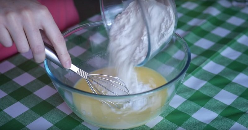 Do uzyskanej wcześniej mieszanki jajecznej przesiewamy mąkę, mieszając w taki sposób, aby zniwelować powstałe gródki.