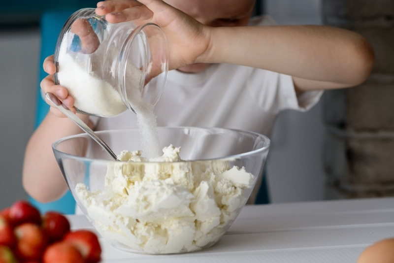 Gdy już przygotujesz placuszki, nadszedł czas na przyrządzenie twarogu. Możesz o pomoc poprosić dzieci. Twaróg wystarczy utrzeć z cukrem i jednym jajkiem.