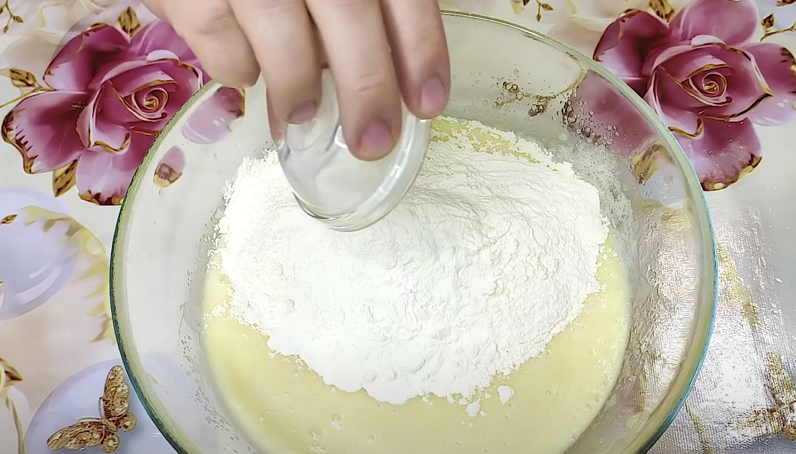 Ubij jajka z cukrem za pomocą trzepaczki. Dodaj roztopione masło i jogurt. Dobrze wymieszaj.