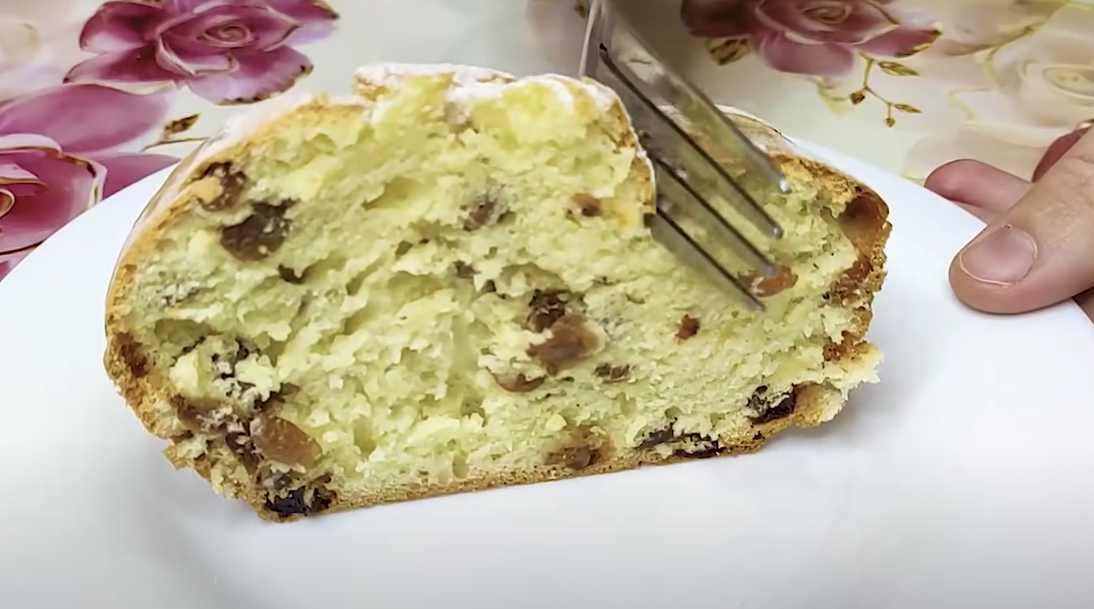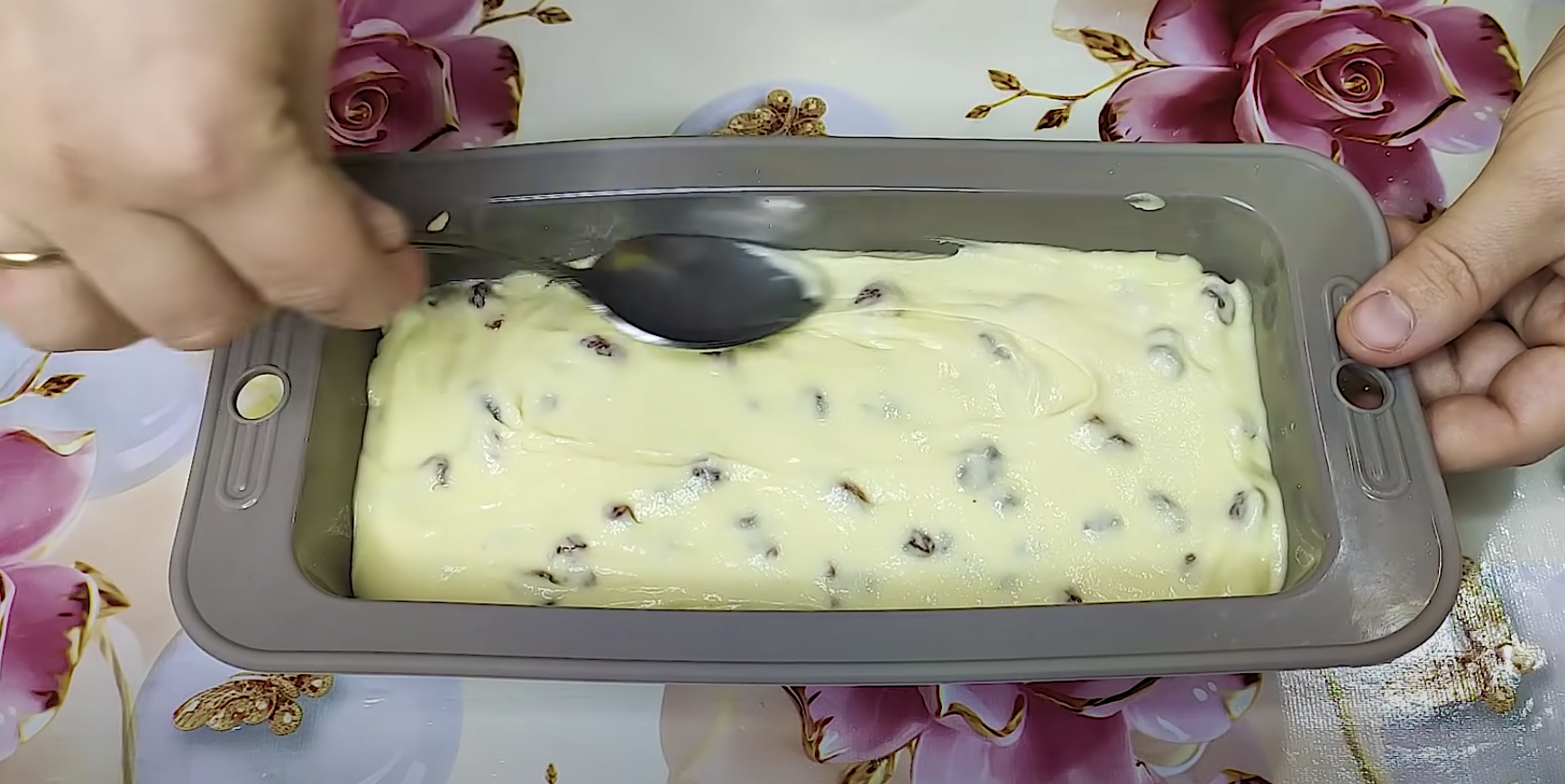 Stopniowo dodawaj mąkę i proszek do pieczenia. Wymieszaj gęste i jednolite ciasto. Dodaj rodzynki (lub inne suszone owoce) i ponownie wymieszaj. Wlej ciasto do foremki (10*22 cm). Wstaw do nagrzanego piekarnika w temperaturze 170°C na 30-35 minut.