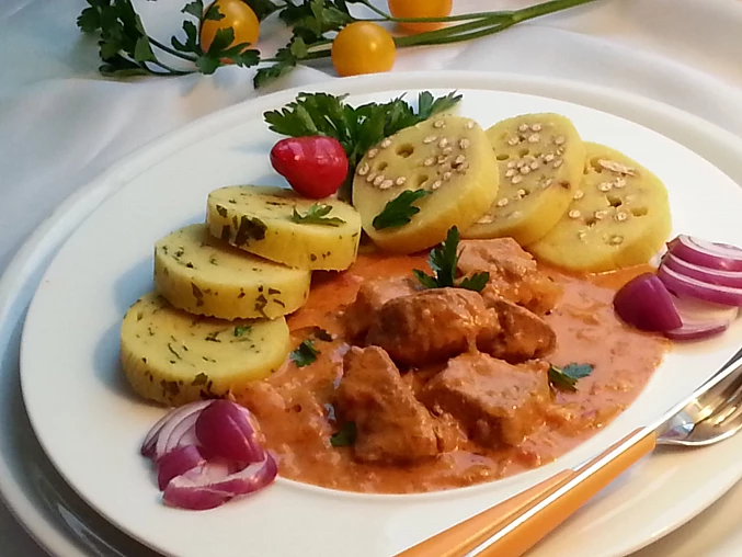 Zalewamy wodą, dodajemy bulion, puszkę pomidorów i gotujemy na wolnym ogniu. Gdy mięso będzie już prawie miękkie, dodać ostrą paprykę, kiełbasę i dalej dusić, aż mięso będzie całkowicie gotowe. W razie potrzeby dodać więcej do smaku, dodać bitą śmietanę i w razie potrzeby zagęścić mąką kukurydzianą (w takim przypadku gotować dłużej).