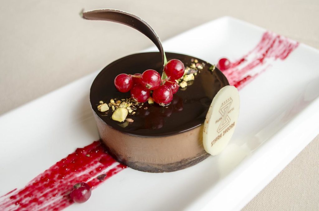 Krem wyłożyć na deser i rozsmarować. Na koniec ułożyć kostki czekolady.