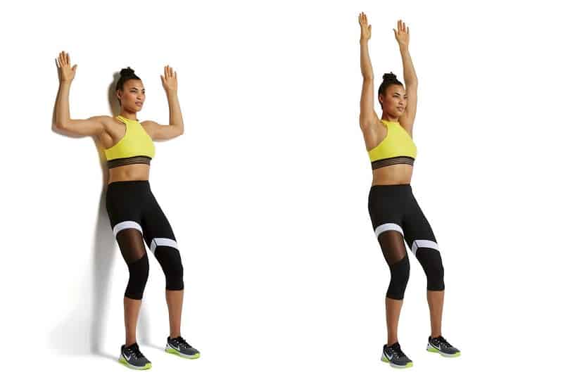 Rozciąganie rąk na ścianie jest ćwiczeniem wzmacniającym górne partie pleców i ramiona. Stań tyłem do ściany i oprzyj o nią głowę, plecy i pośladki, jednocześnie ustawiając nogi w odstępie ok. 30 cm od ściany. Następnie unieś zgięte w łokciach ręce i oprzyj je o ścianę po obu stronach głowy. Wychodząc z tej pozycji wyjściowej, powoli unoś ręce i prostuj je nad głową, nie odrywając od ściany. Powtórz to ćwiczenie 15 razy, za każdym razem wracając do pozycji wyjściowej.