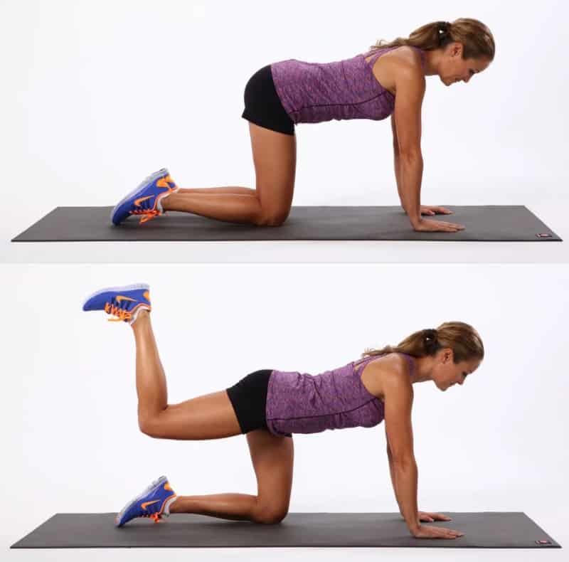 To ćwiczenie pozwoli ci trenować mięśnie ud i pośladków, jednocześnie dbając o zdrowy kręgosłup. Uklęknij, opierając ciało na wyprostowanych rękach i napnij mięśnie brzucha, tak, aby plecy były utrzymane w linii prostej. Następnie powoli, naprzemiennie unoś zgiętą w kolanie nogę. Po każdym wymachu wróć do pozycji wyjściowej, wykonując 12-15 powtórzeń na każdą nogę.