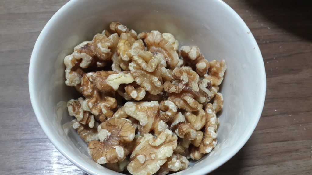 Posiekaj orzechy, przygotuj jajko i mrożone wiśnie. Dodaj posiekane orzechy włoskie do miski.