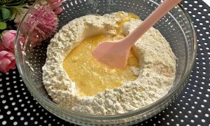 Mąkę pszenną przesiać do miski i zrobić w środku dołek. Wsyp do niego rozkruszone drożdże, zalej odrobiną ciepłej wody. Dodaj jajka, oba cukry i wymieszaj te składniki w środku mąki. Mąkę posypać łyżką soli (nie może stykać się z drożdżami) i dodać mleko.