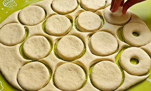 Wyrośnięte ciasto przełożyć na lekko oprószoną mąką stolnicę i rozwałkować na naleśnik o grubości około pół centymetra. Wytnij z niego koła za pomocą szklanki lub noża, pośrodku którego wytnij kolejne mniejsze kółko.