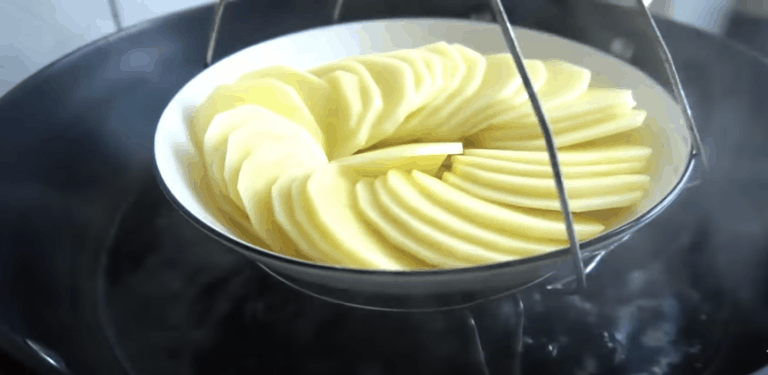Ziemniaka umyj, obierz i pokrój w cienkie talarki. Gotuj na parze lub w wodzie przez ok. 20 minut, do miękkości.