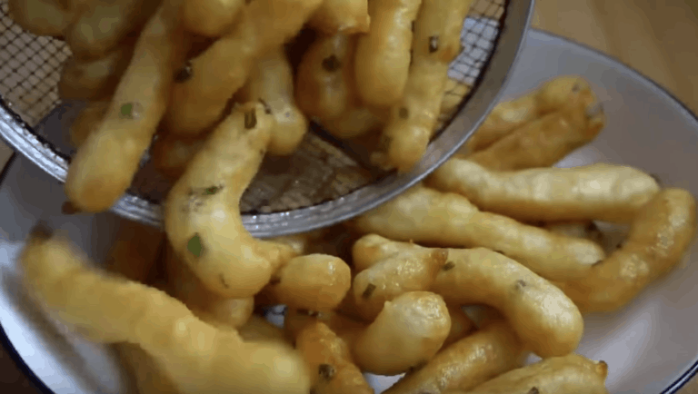 Rozgrzej w garnku sporą ilość oleju. Wyciskaj do niego niewielkie porcje ciasta z worka, formując pałeczki. Smaż, aż będą złociste.