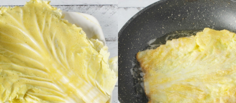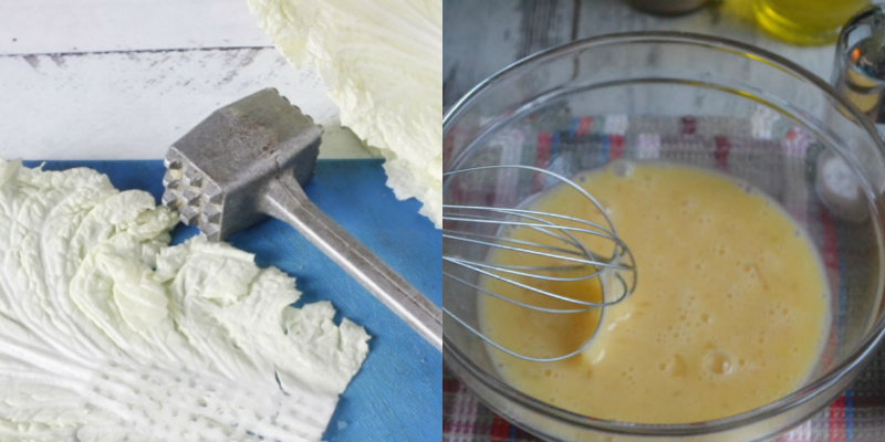 Obierz liście kapusty pekińskiej. Wytnij ich twardą część. Rozbij liście za pomocą tłuczka. W misce wymieszaj jajka, sól i pieprz. Dodaj mąkę i wymieszaj, aby nie było w masie grudek.