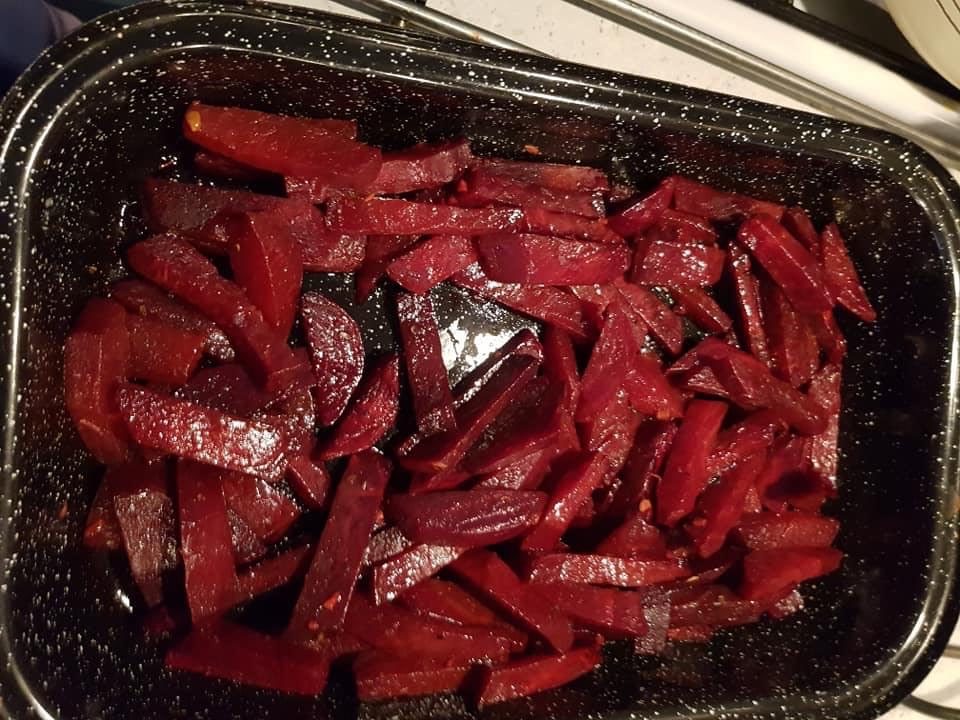 Piekarnik rozgrzewamy do 220 stopni. Myjemy buraki, obcinamy górę i dół, większe egzemplarze kroimy na pół. Owijamy każdy kawałek w folię aluminiową i pieczemy przez 45 minut, aż zmiękną. Po wystudzeniu obieramy i kroimy w kostkę. Mieszamy kostki z oliwą, miodem, octem i przyprawami, układamy na blaszce i pieczemy dodatkowe 10 minut. Smacznego!