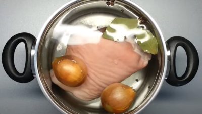 Włóż kolano wieprzowe do garnka, dodaj liść laurowy, ziele angielskie i cały czarny pieprz. Wszystko posolić i zalać mięso wodą tak, aby było całkowicie zanurzone. Do garnka wrzucamy dwie umyte cebule w skórkach i doprowadzamy wodę do wrzenia. Gotuj mięso przez 2-3 godziny.