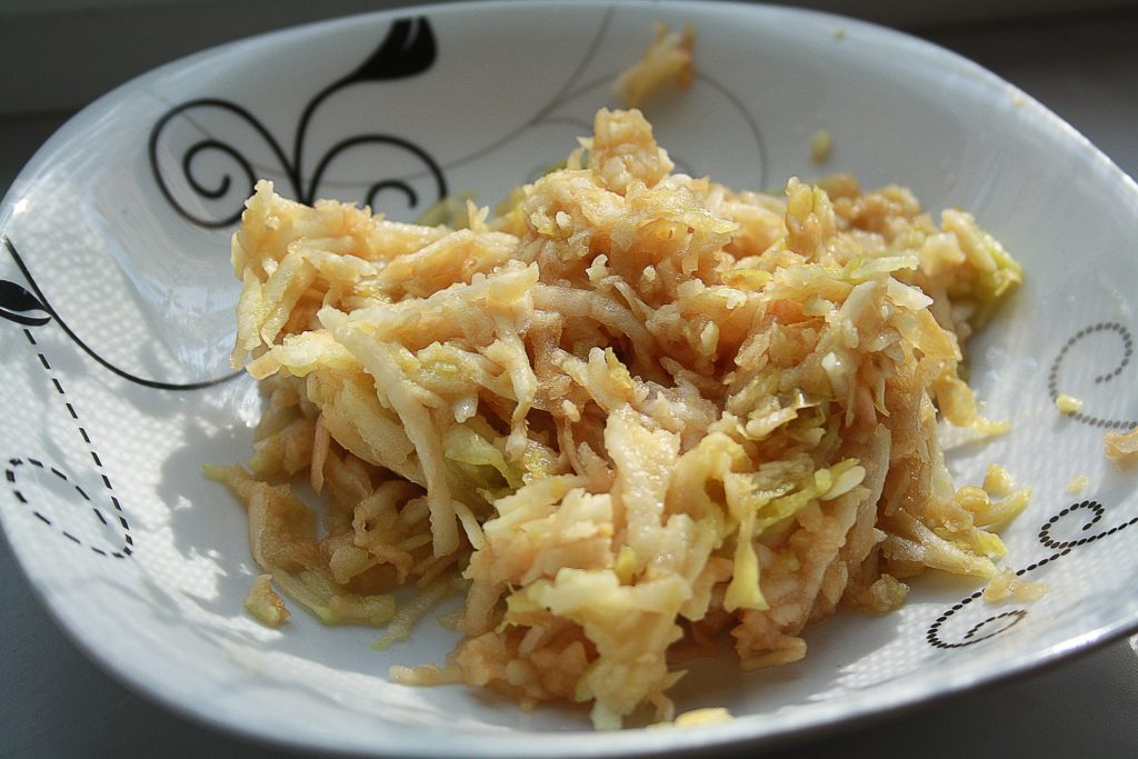 Dodać jajka, letnie mleko, olej i wszystko razem wymieszać. Dodać grubo starte jabłka, posiekane orzechy i rodzynki. Wszystko razem mieszamy.