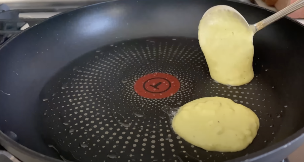 Na koniec dodaj mąkę i wymieszaj na jednolite ciasto. Na koniec dodaj olej. Przygotuj patelnię i użyj chochli, aby dozować poszczególne placuszki na patelnię.