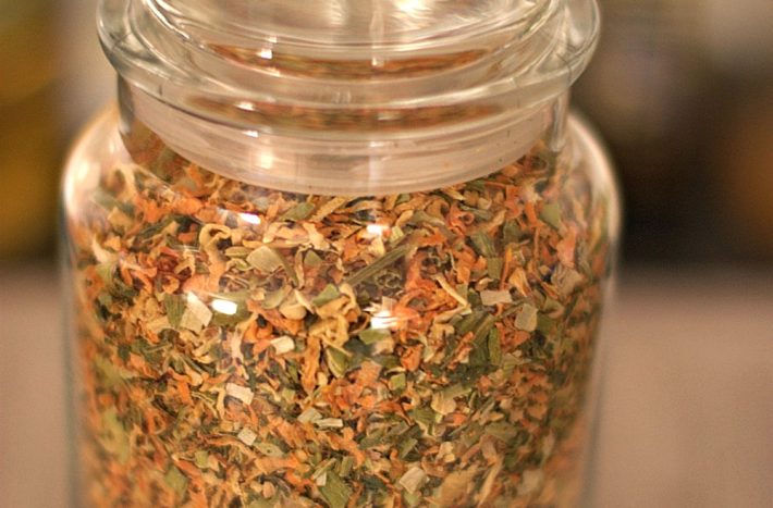 Po wysuszeniu, połącz warzywa z przyprawami i dokładnie wymieszaj, aż uzyskasz proszek. Możesz użyć blendera, aby uzyskać bardziej jednolitą konsystencję.